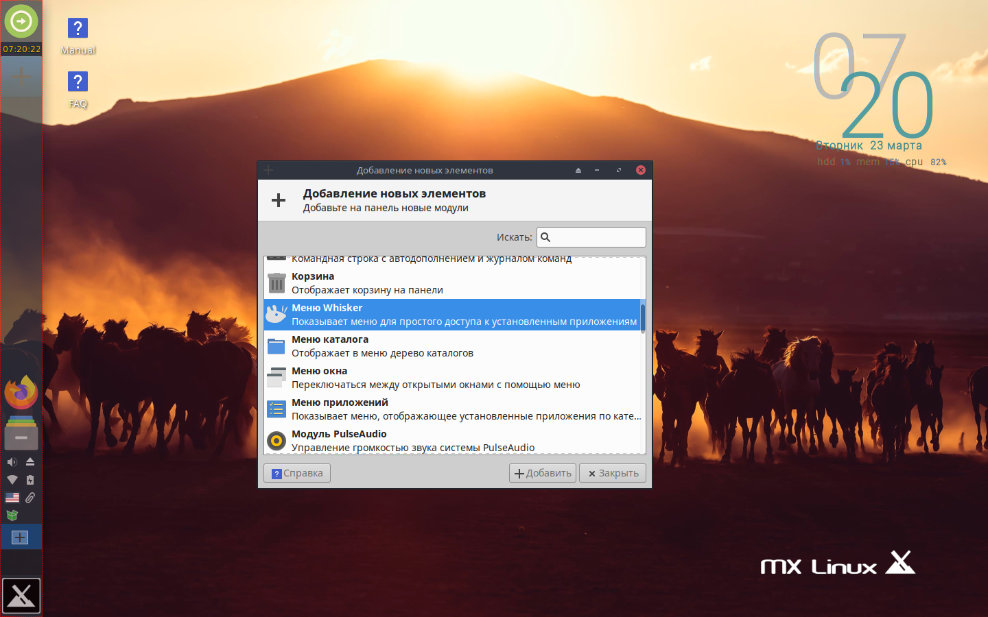 Many users note that the Whisker Menu is more convenient than the standard one. To activate it, right-click on the notification area and go toPanel — Add new elements.