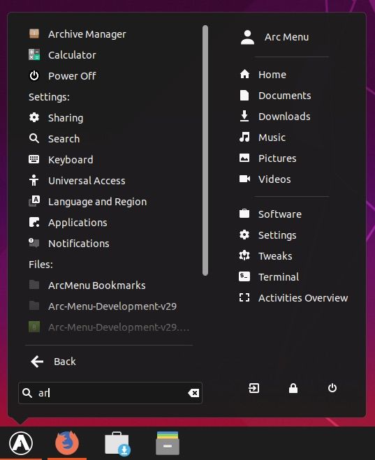 The panel “search” in the Arc Menu has been rewritten to better fit the main screen of the GNOME Shell.