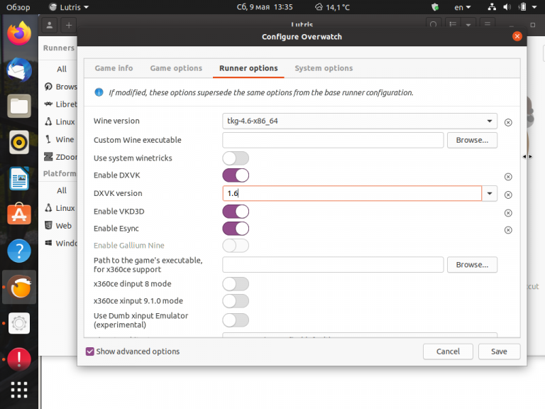 In the opened window, go to Runner options and select Show advanced options. The window displays the new object drop-down list DXVK versions.