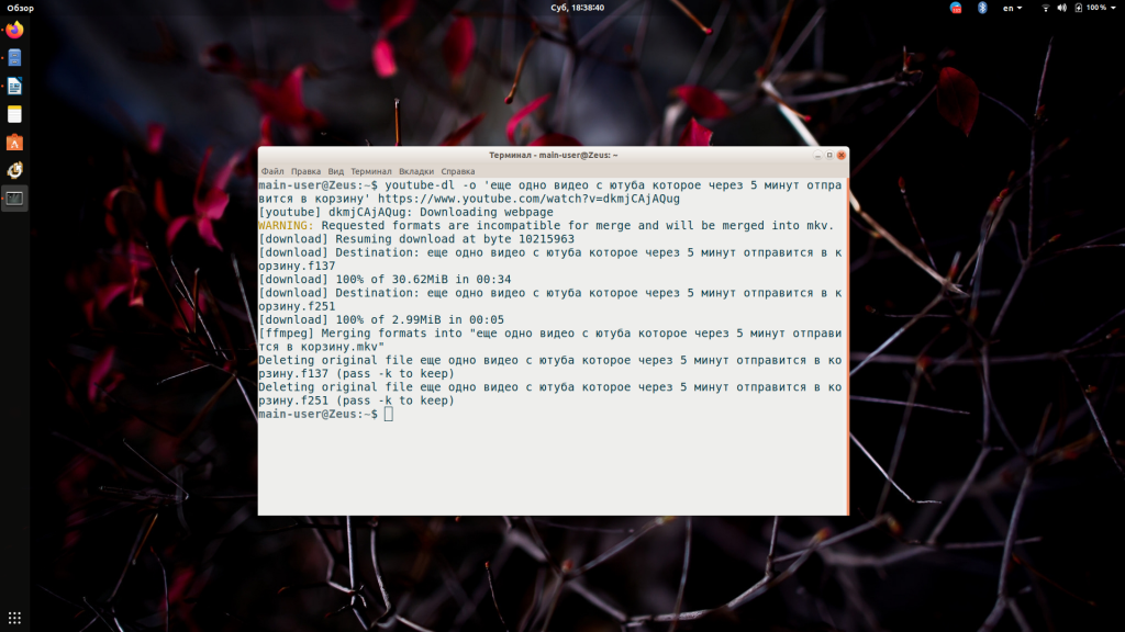 youtube-dl-o '~/Downloads/another video from YouTube which after 5 minutes will go in the basket' https://www.youtube.com/watch?v=dkmjCAjAQug