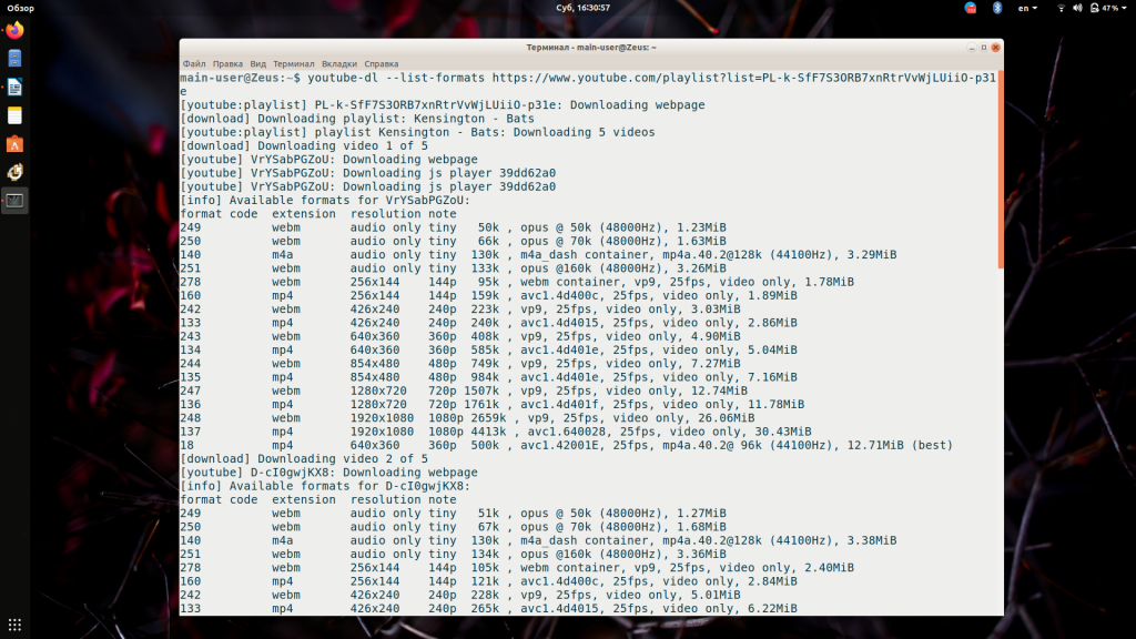 Sometimes, the download of the video there is a need to know in which formats it is available. This information is easy to obtain by using the option –list-formats. Use it for individual videos and playlists: