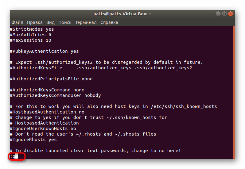 • Here you can change the port used, it’s always better to be done to ensure the security of the connection can then be disconnected login as root (PermitRootLogin) and included activation key (PubkeyAuthentication). After editing is complete, press the key : (Shift + ; on Latin layout) and add the letter wto save the changes.
