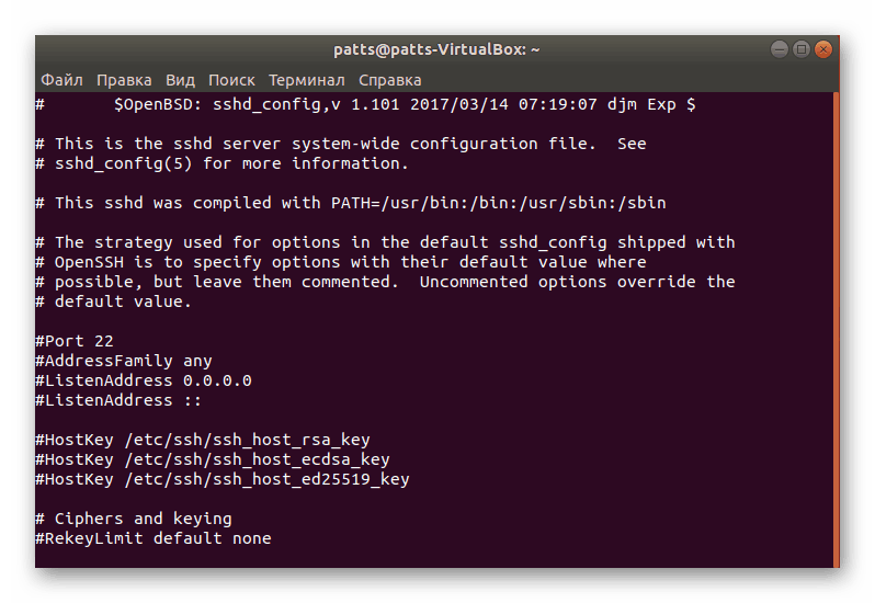 • Run the settings file is executed via sudo vi /etc/ssh/sshd_config. Immediately after entering it will be launched and you will see its contents as shown in the screenshot below.