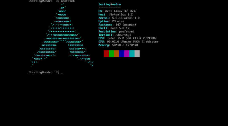 What we have to showcase? Running on a virtual machine a 32-bit Arch Linux without a graphical shell installed neofetch and sudo, as well as provided the average user with root privileges.