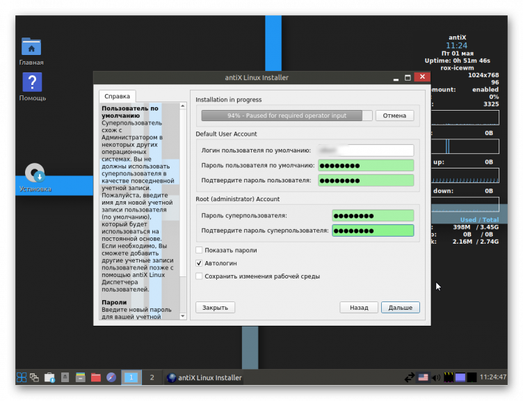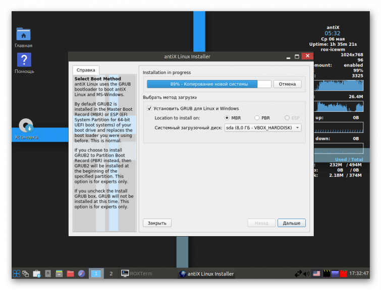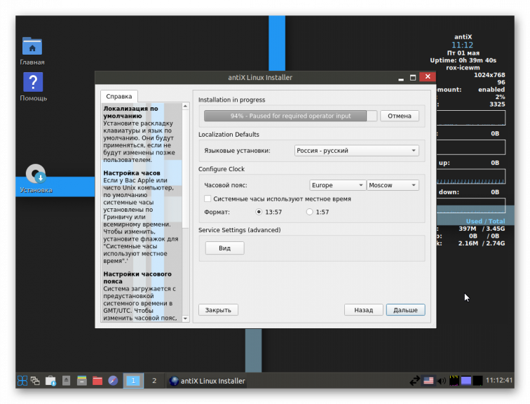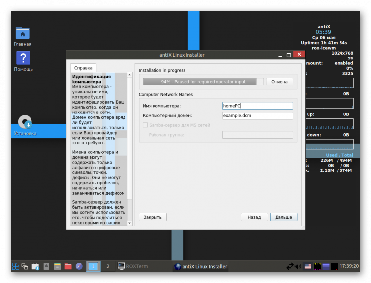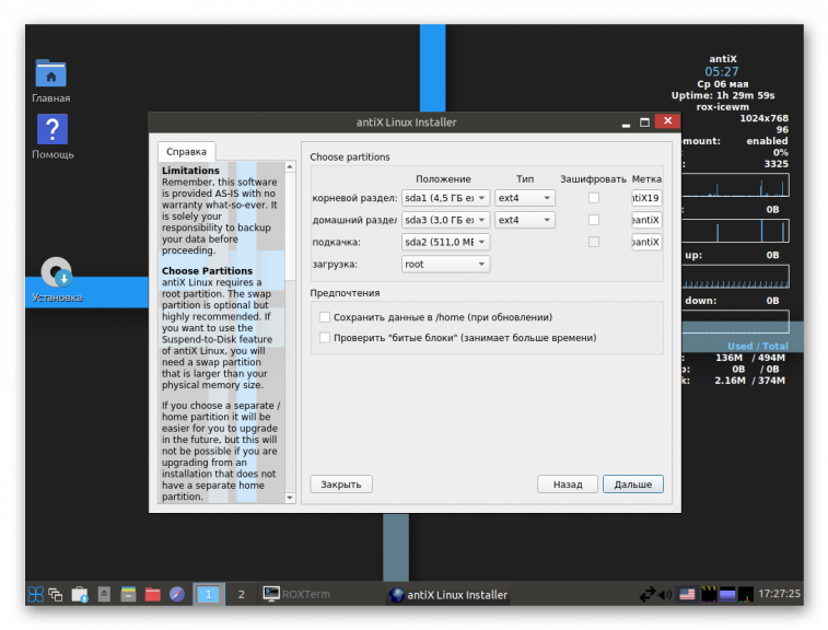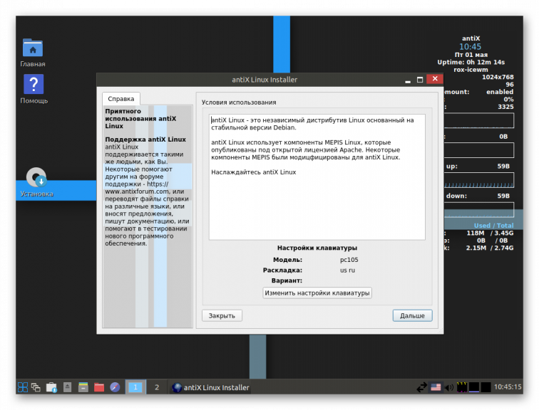 The main advantage of the Linux distribution AntiX — simple and understandable step-by-step installation with the possibility of a rich selection of settings and support at each step, handy tips and valuable explanations.