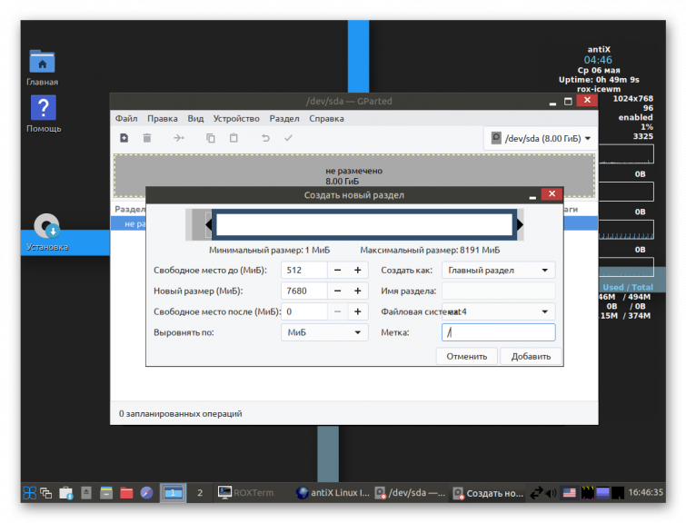 A window will appear in which you will need to set the parameters of created partition. First, create the root partition root. In field Free space , specify 512 MB (this is reserved for swap). Set the disc label, specify the size and then click Add.