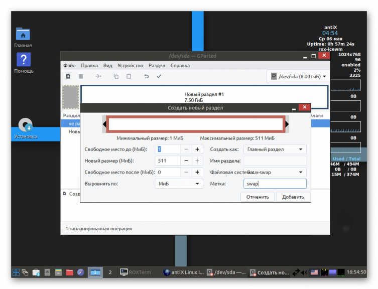 The same way to create the swappartition. It is required for the application in a situation if there is a shortage of RAM. When setting the partition size of swap is recommended to specify a value slightly greater than the RAM size. This will allow you to work more comfortable with applications that require lots of memory. Specify the amount of the new partition (in this case 512 MB), a label swap, and select file system — linux-swap. Click Add.