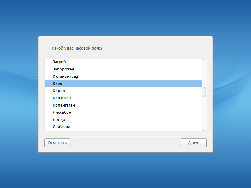 Select the time zone. Menu selection is not very convenient, as there are no values of deviation from GMT: