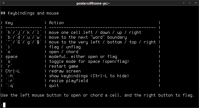 minesVIiper allows you to set the field size and number of mines, there are several color schemes (you can easily add more), the cheat mode (cheat mode), timer and counter flags. For uses VI-like (vim-like) keyboard shortcuts and/or mouse is fully supported Unicode (Unicode).