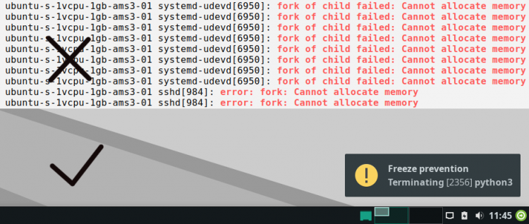nohang is a command — line Python utility that enables you to configure the emergency shutdown process consuming the most memory in the system. The utility works in user space and is an alternative for Linux Out-of-Memory Killer (OOM Killer).