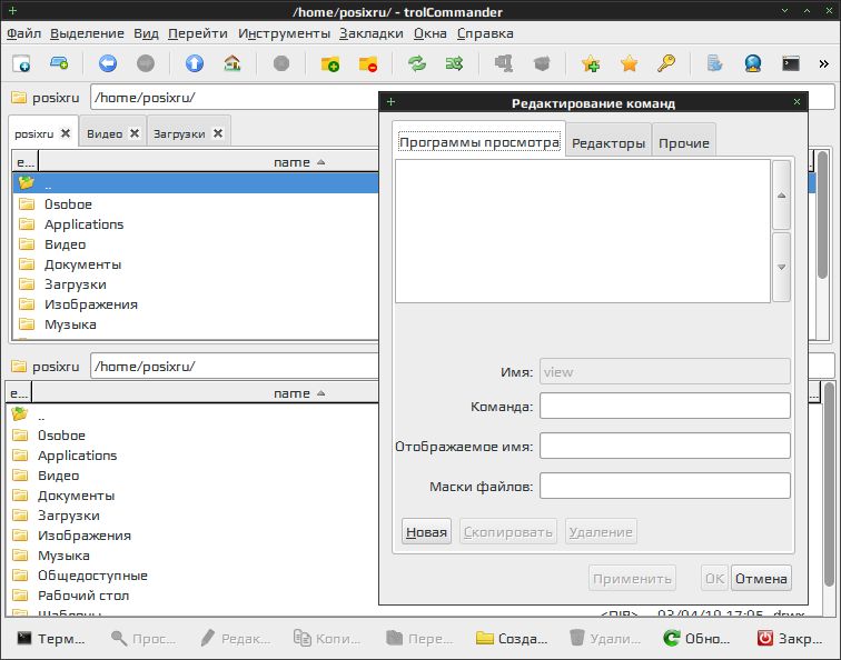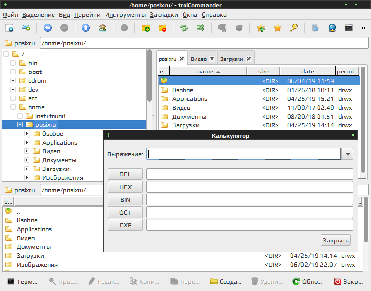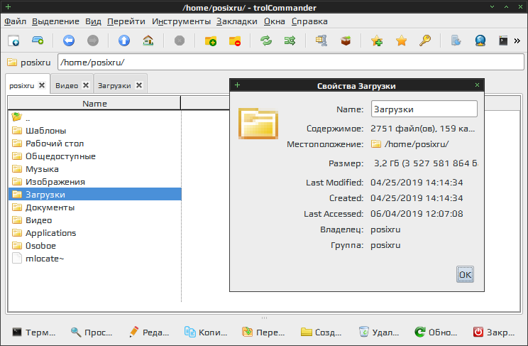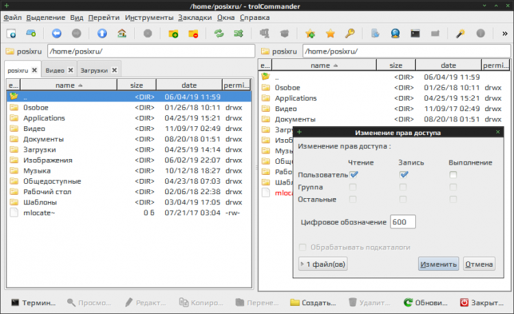 trolCommander has all of the features characteristic of file managers functionality needed to work with the filesystem: copy, move, rename, delete files and directories, creating directories, view size, access rights, etc…